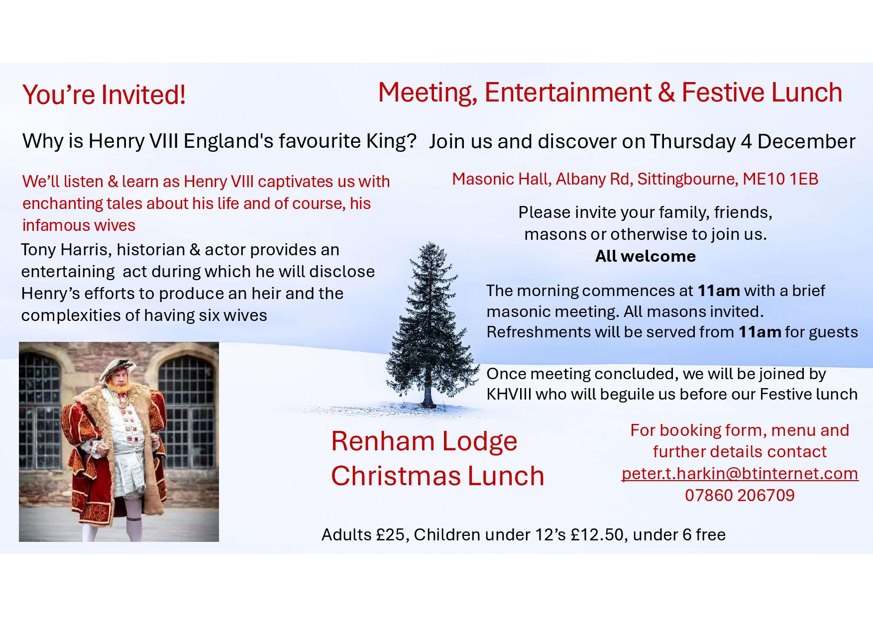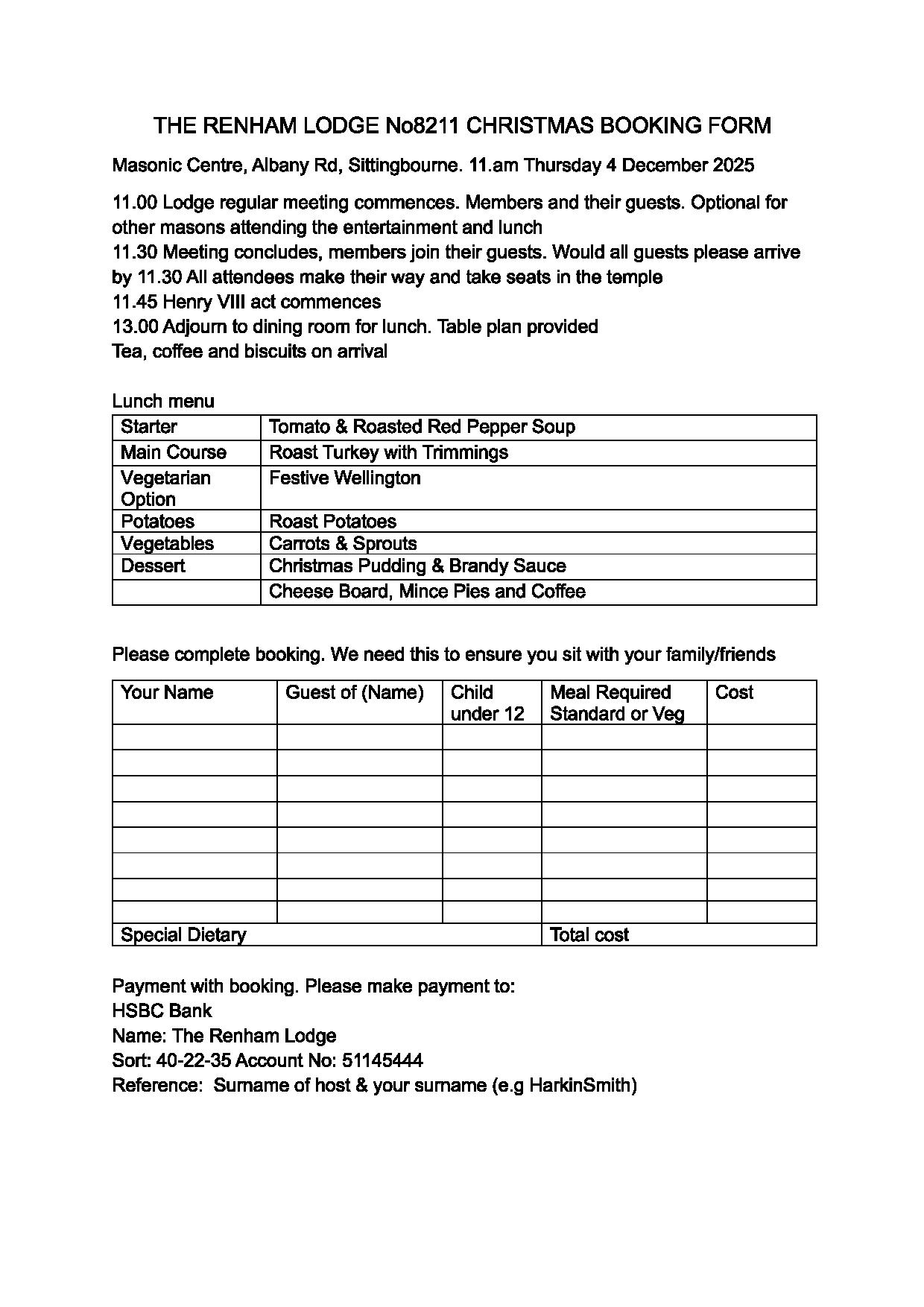 Renham Lodge Christmas Lunch and Talk When 04/12/2025 11:00 - 13:00 Add To Calendar Download ICS Google Calendar iCalendar Office 365 Outlook Live Where Sittingbourne Masonic Hall Albany Rd, , Sittingbourne , Kent Event Type Event christmas, lunch TO DOWNLOAD THE BOOKING FORM CLICK HERE