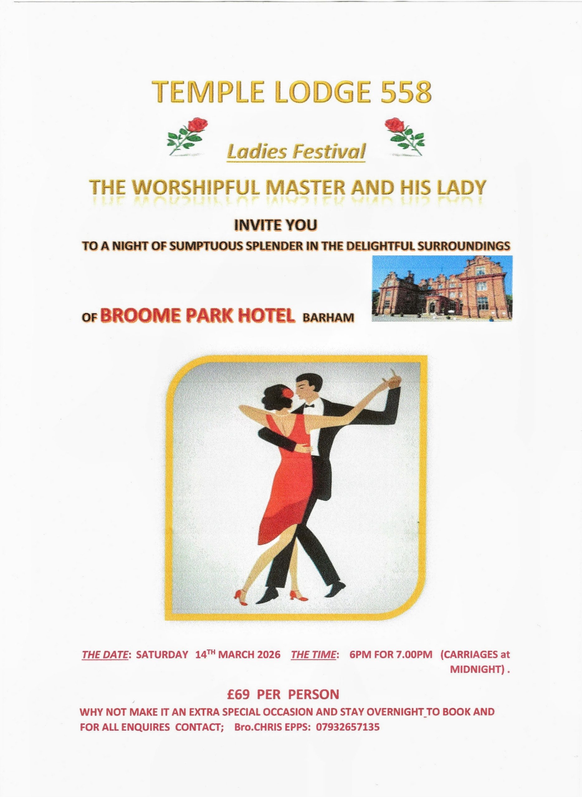 Temple Lodge Ladies Festival When 14/03/2026 18:00 - 23:45 Add To Calendar Download ICS Google Calendar iCalendar Office 365 Outlook Live Event Type Event East Kent Freemasons, Ladies Night Dance This is a Lodge event, please do not book via the Province. All Enquiries should be directed to the Lodge. Contact Anthony Hill, details on the poster.