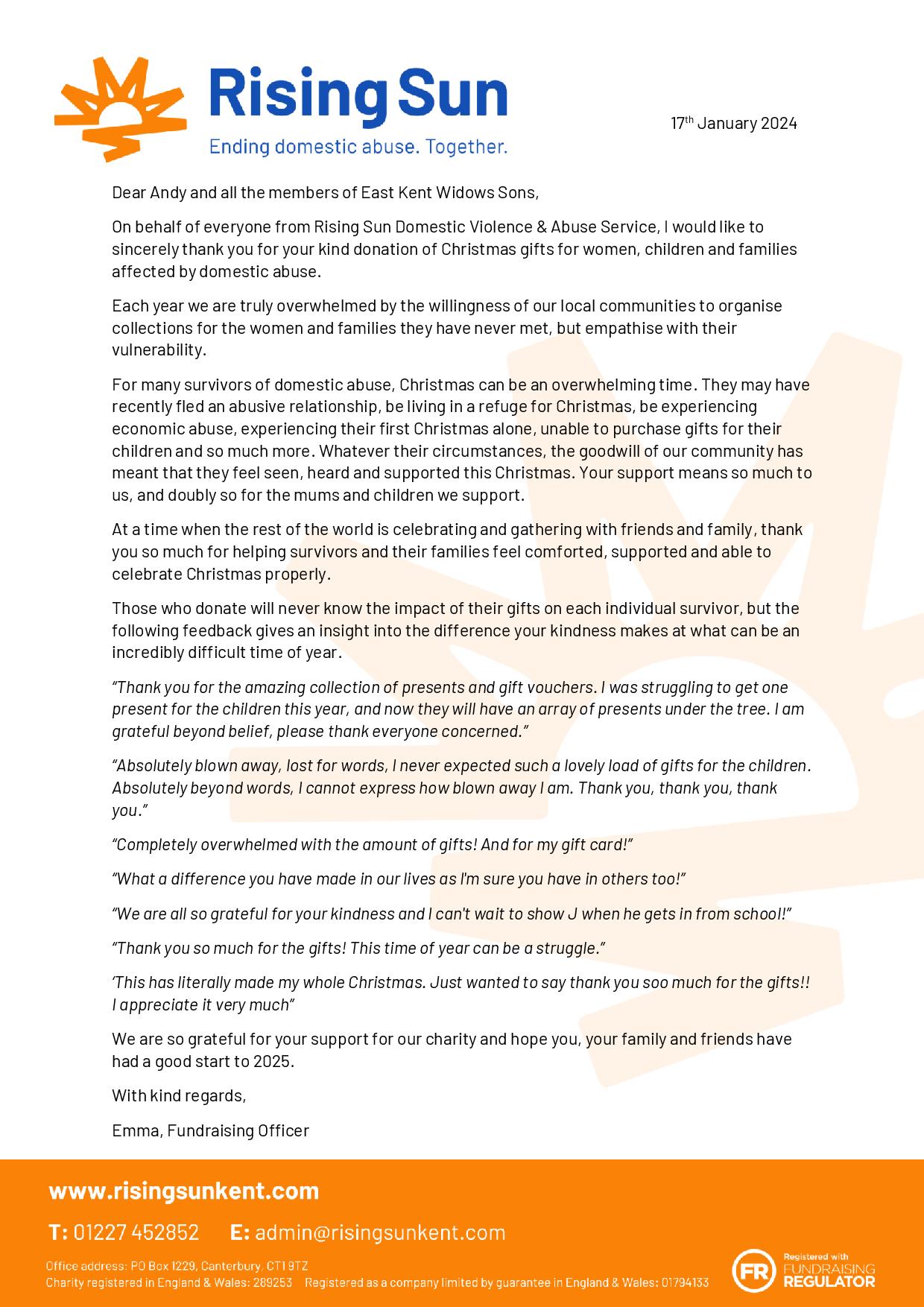 Words say so much, here is a letter of thanks from the Rising Sun Domestic Abuse Charity, written to Andy of the East Kent Widows Sons Masonic Motorbike Group.